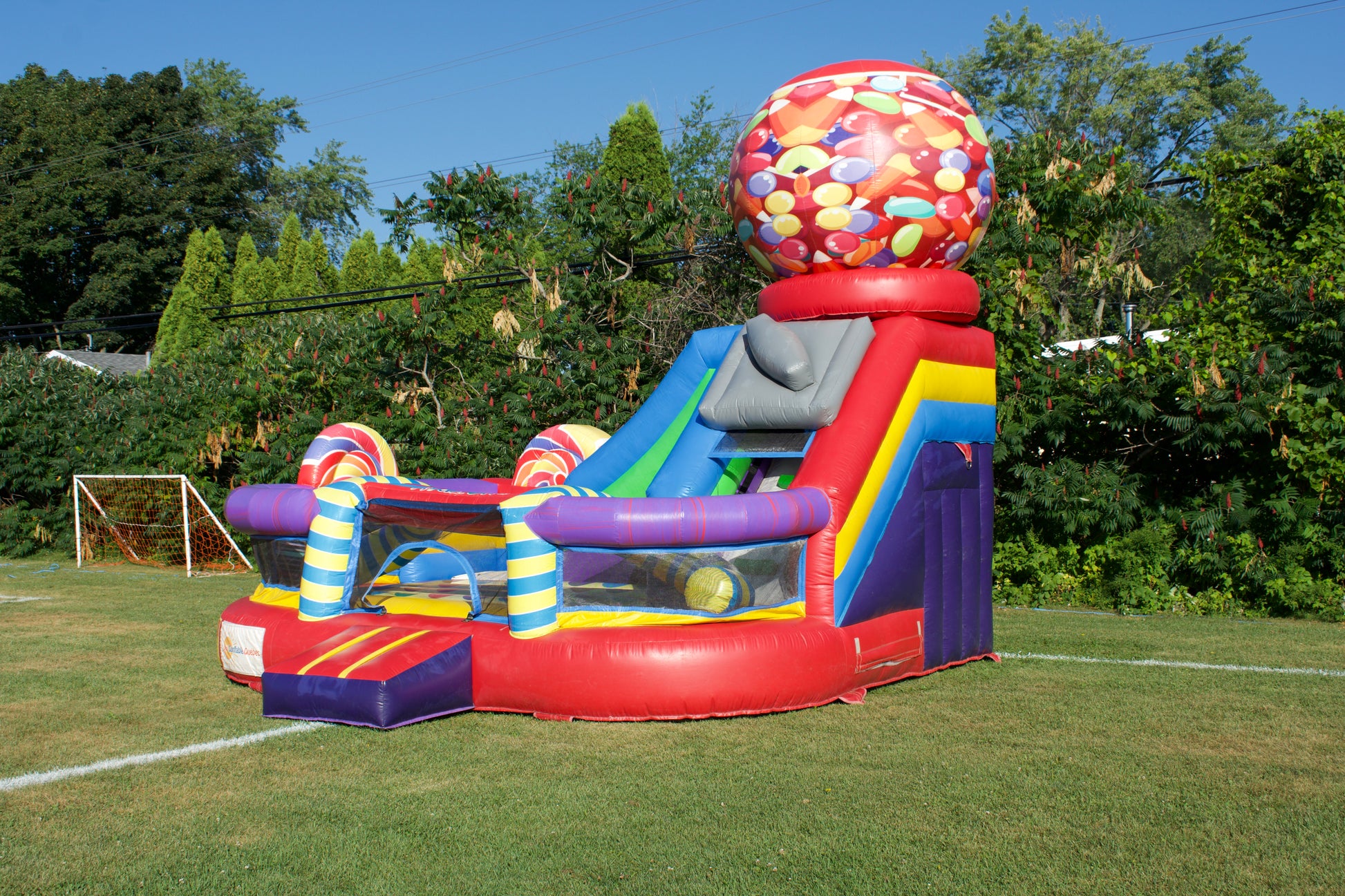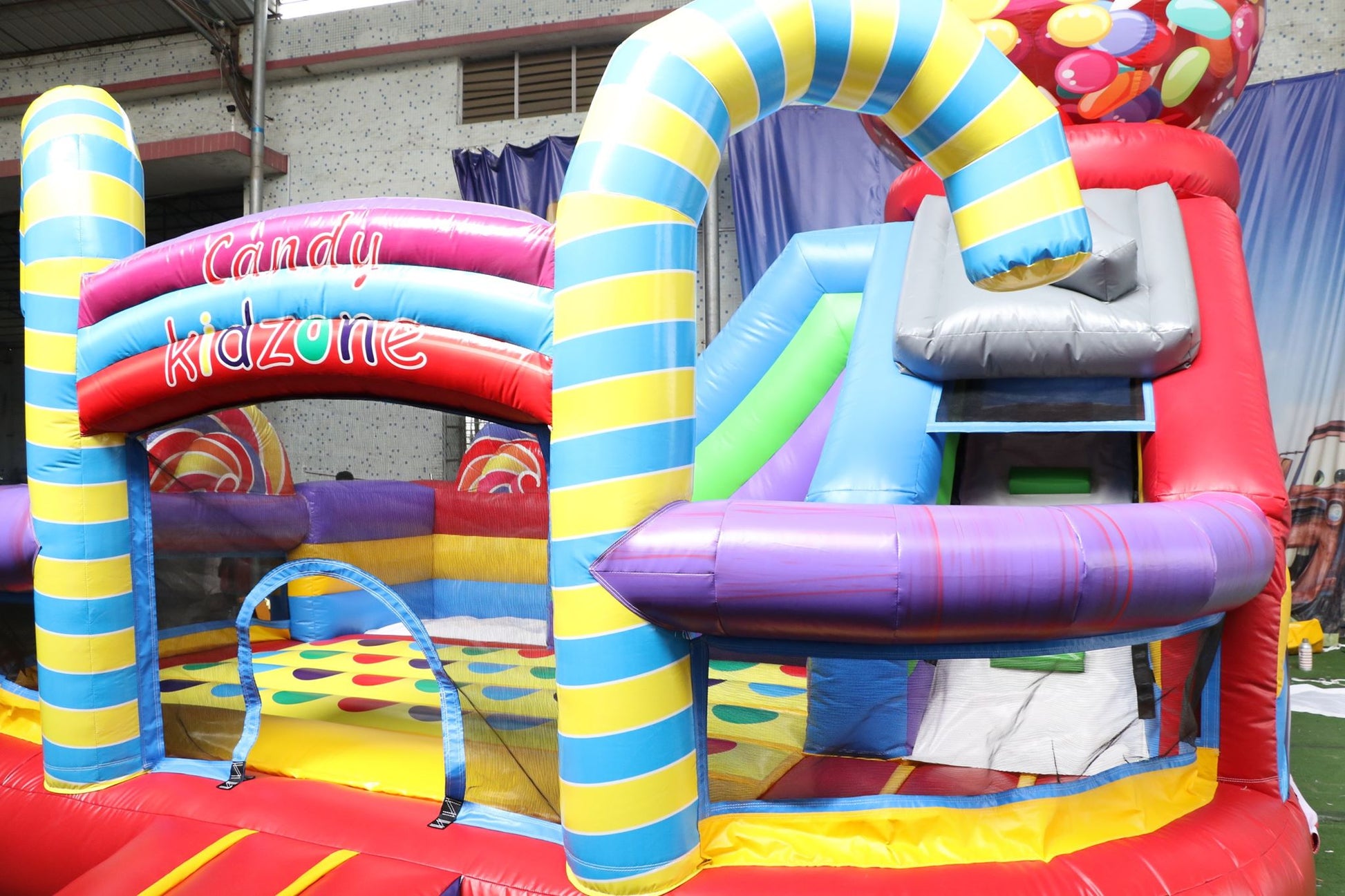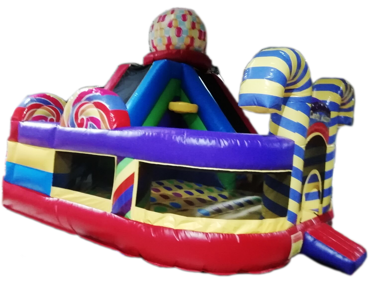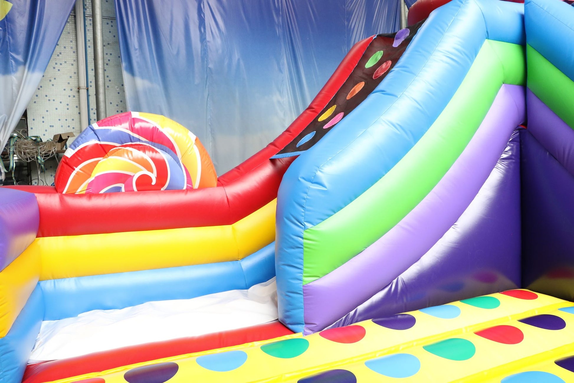 Multiactivités comprenant un grand sautoir et une glissade, sous la thématique Bonbons. Mettez de la couleur et de la joie avec ce super combo coloré.